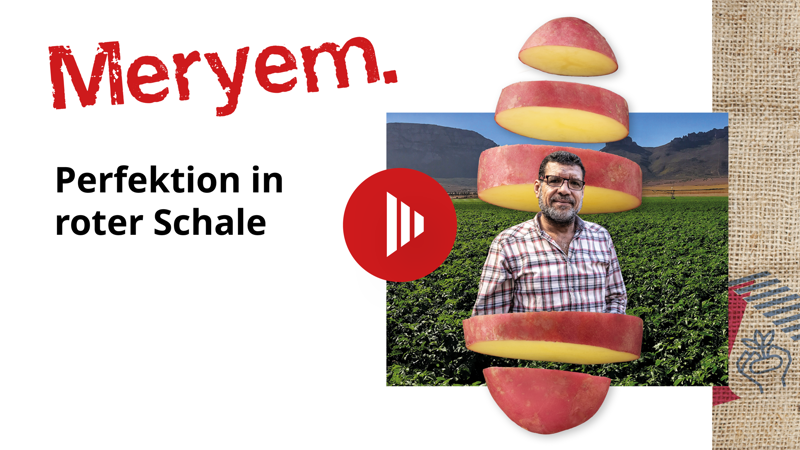 Diese Sorte kennzeichnet sich durch ihre großen Knollen, ihre einheitliche Sortierung und ihre auffällige rote Farbe, was sie zu einer sehr beliebten Sorte auf den konventionellen Märkten macht. Mit außergewöhnlich hohen Erträgen und ihrem auffälligen Aussehen ist Meryem ein wahrer Hingucker. Diese Sorte überzeugt nicht nur durch ihre Vielseitigkeit in der Küche, sondern mit ihrer hervorragenden Virusresistenz auch im Anbau. Die Sorte bietet Erzeugern wie Verbrauchern unzählige Möglichkeiten.