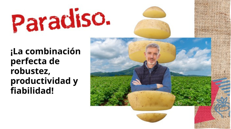 ¡Paradiso lo tiene todo! Esta variedad da unas cosechas impresionantes con gran cantidad de tubérculos, y también destaca por su consistencia. Su planta robusta hace que Paradiso sea una elección de confianza, incluso en zonas más calurosas. Paradiso es sinónimo de éxito año tras año, rendimientos constantes y patatas preciosas. Únase al resto de clientes satisfechos y descubra la constancia y la calidad que ofrece esta variedad. ¡Cosechas infalibles con Paradiso!