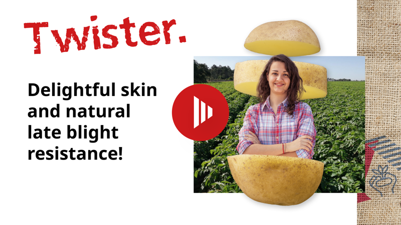 Esta patata temprana, adecuada para cultivo ecológico y convencional, es una de las variedades Next Generation de Agrico. Twister presenta una resistencia natural al mildiu y posee una bonita piel. Se puede preparar de muchas formas, y es una opción excelente en la cocina. Su excepcional dormancia hace que Twister mantenga su calidad durante mucho tiempo, permitiendo que los consumidores disfruten de esta patata bonita y deliciosa a lo largo de todo el año. Twister: ¡descubra el equilibrio perfecto entre belleza y resistencia!