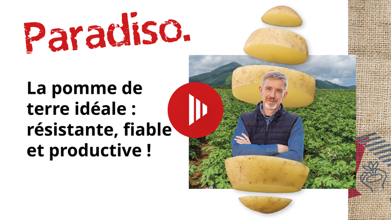 Paradiso est le mélange idéal de caractéristiques, car elle donne des rendements impressionnants avec un nombre élevé de tubercules, et d’une grande régularité. La variété Paradiso donne des plantes fortes et constitue donc un choix sûr et fiable, même dans les régions chaudes. Paradiso est la garantie de réussir votre récolte chaque année, d’obtenir des rendements constants et de belles pommes de terre. Devenez-vous aussi un client satisfait et avec Paradiso, offrez-vous une sécurité de production et une grande qualité. La certitude de récolter, avec Paradiso !